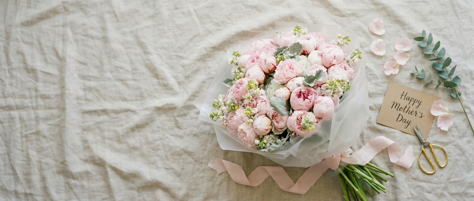 Pink peony bouquet with white stock flowers and dusty miller leaves wrapped in sheer tulle ribbonLuxurious pink peony bouquet with dusty miller foliage and white accent flowers wrapped in soft pink paper
